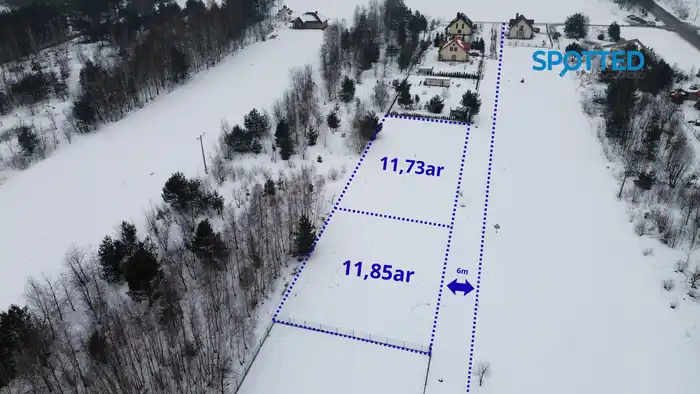Dojazd jest wygodny i w pełni uregulowany – zjazd bezpośrednio z drogi gminnej asfaltowej, a następnie droga na zasadzie współwłasności (w cenie działki) o szerokości ok. 6 m, co zapewnia komfortowy i bezproblemowy dostęp do nieruchomości.