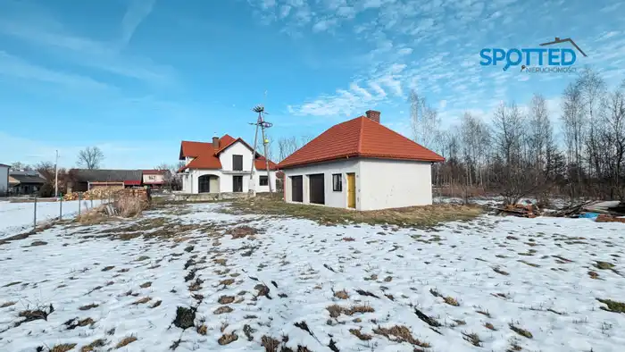 Na działce znajduje się również budynek gospodarczy z miejscem na dwa samochody. 🚗 Posiada dwie bramy wjazdowe, wejście z dwóch stron, wykonaną elewację oraz dach pokryty blachodachówką. W środku znajduje się łazienka w stanie deweloperskim, a media zostały do niego doprowadzone. To dodatkowa przestrzeń, która może pełnić funkcję garażu, warsztatu lub zaplecza pod działalność.