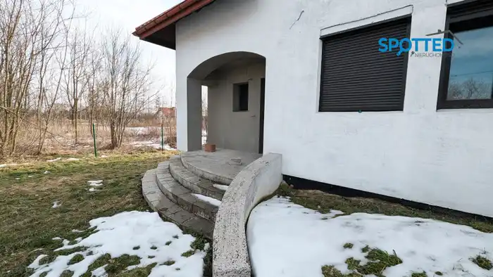 Dom usytuowany jest na dużej, ustawnej działce o powierzchni 29,04 ar ogrodzonej słupkami - do zakończenia brakuje jedynie siatki oraz ogrodzenia od strony frontowej. Dojazd do posesji zapewnia droga gminna asfaltowa.