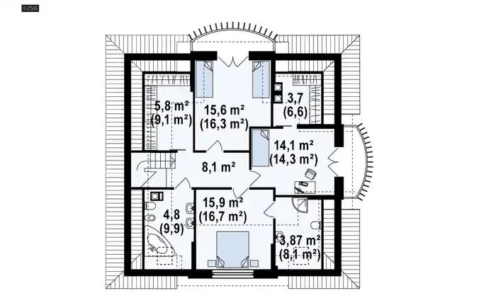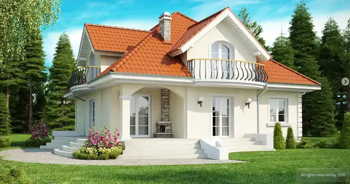 Wnętrze domu zostało zaprojektowane bardzo funkcjonalnie. Łącznie oferuje 5 pokoi – w tym 4 niezależne sypialnie oraz przestronny salon z otwartą kuchnią. Z kuchni przewidziano wejście do spiżarni, a w centralnej części strefy dziennej zaplanowano miejsce na kominek lub kuchnię kaflową, co daje możliwość stworzenia klimatycznego i niezależnego źródła ciepła 🔥 Jedna z sypialni posiada prywatną łazienkę, a druga garderobę . Dodatkowo na piętrze znajduje się jeszcze jedna, duża garderoba, która można zaadaptować na bawialnię lub bibliotekę. Na parterze zaprojektowano osobne WC, wiatrołap z przejściem do kotłowni/pomieszczenia gospodarczego, a pod schodami miejsce na pralnię. Dodatkową przestrzeń stanowi strych na całej powierzchni domu. Na piętrze znajdują się również dwa balkony podkreślające elegancki charakter bryły.